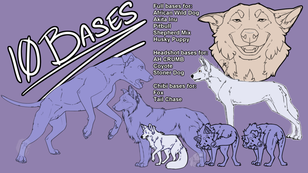 Ten different bases including African wild dog, Akita inu, pitbull terrier, shepherd mix, husky puppy, AH CRUMB, coyote, stoner dog, fox chibi, and tail chase chibi.